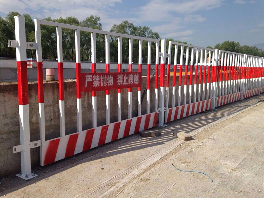 基坑護欄由防護網片和立柱組成?;訃鷵踝o欄防護網片由2cm×4cm方管焊接組成,單片尺寸1.1米×1.7米,兩端設有跨耳用Φ10螺栓與立柱連接固定,跨耳與上下邊緣距離為15cm。