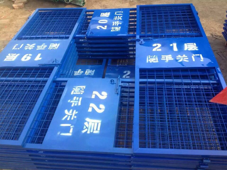 電梯安全防護門全部由鋼結構組成。鋼材采用標準材料,制作嚴格按圖施工,尺寸正確,焊接點牢固,達到防護之目的,電梯安全門采用檸檬黃色,門下部檔架板采用黃、黑間隔。電梯防護門是建筑施工現場預防人身傷害的防護設施,它適用于各類建筑施工工地。